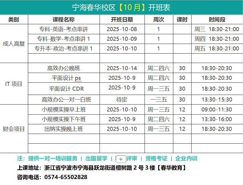 宁海春华校区【十月】开班表