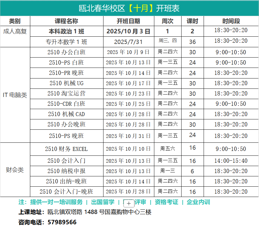 永嘉春华校区【十月】开班表
