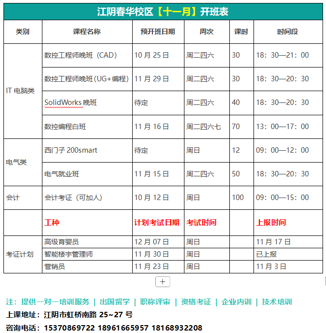 江阴春华校区【十一月】开班表