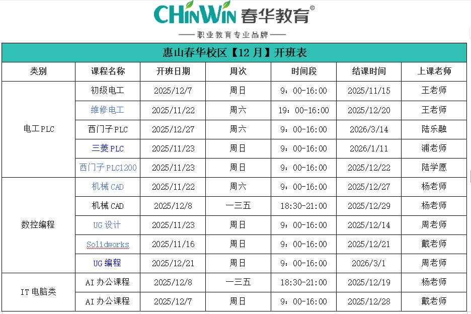 惠山春华校区【十二月】开班表