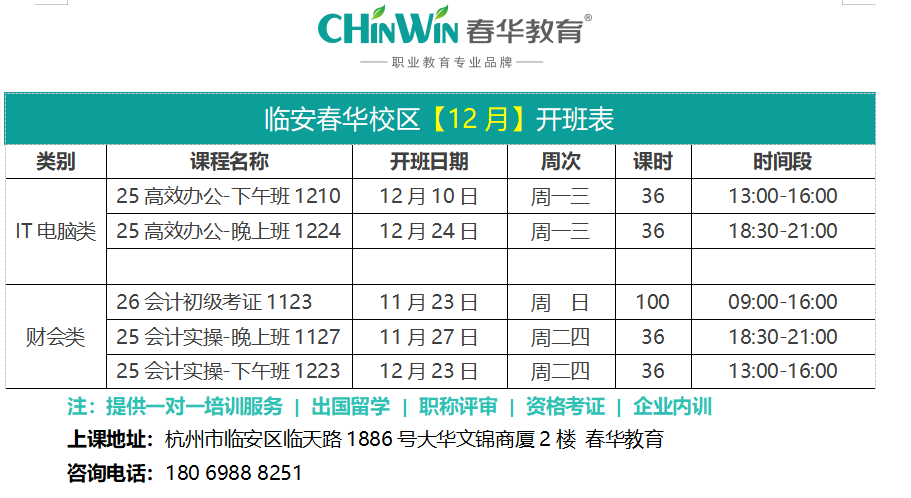 临安春华校区【十二月】开班表