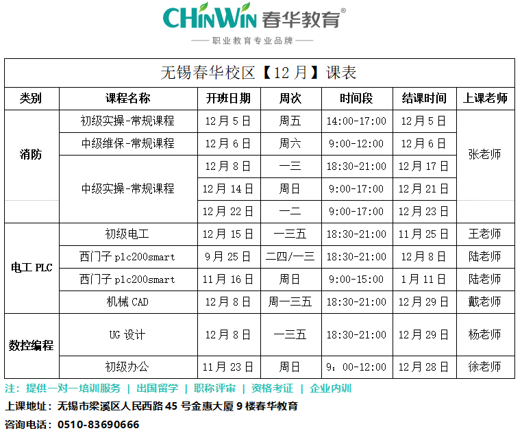 无锡春华校区【十二月】开班表