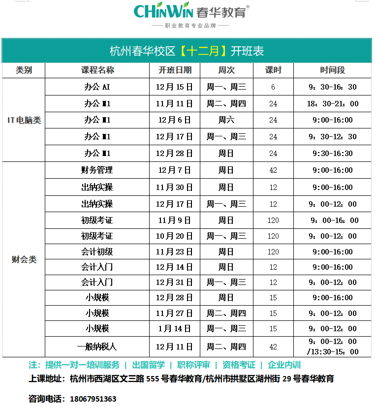 杭州春华校区【十二月】开班表