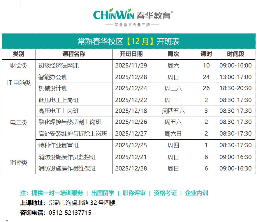 常熟春华校区【十二月】开班表