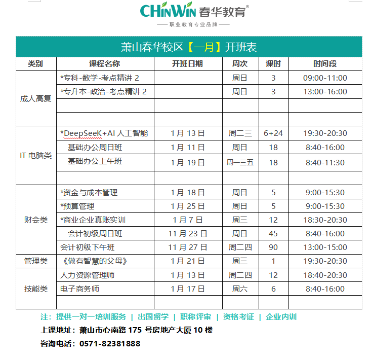 萧山春华校区【一月】开班表
