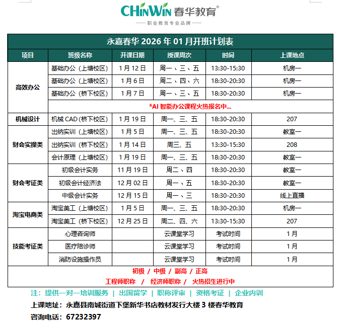 永嘉春华校区【一月】开班表