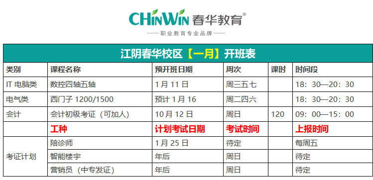 江阴春华校区【一月】开班表