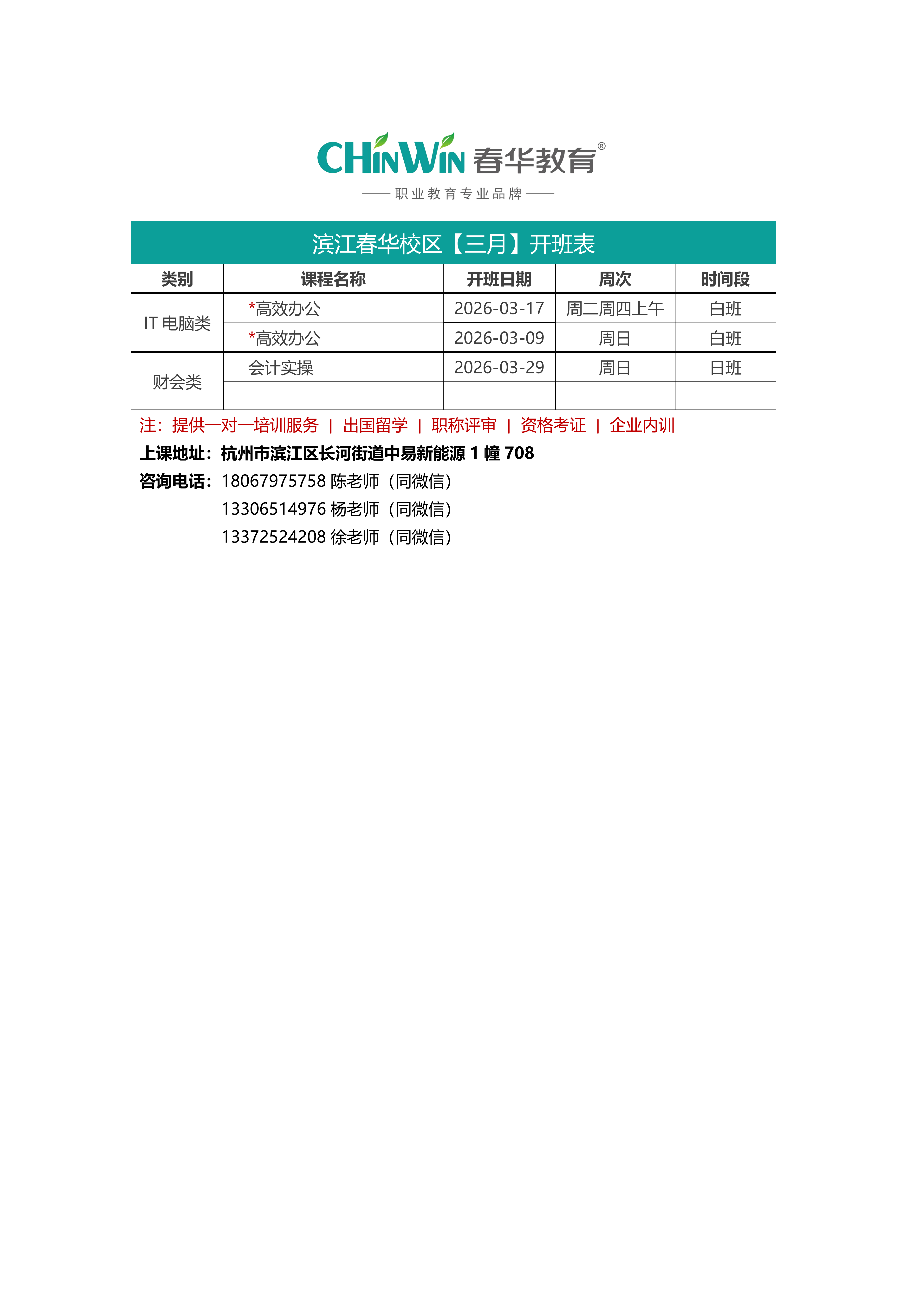 滨江春华校区【三月】开班表