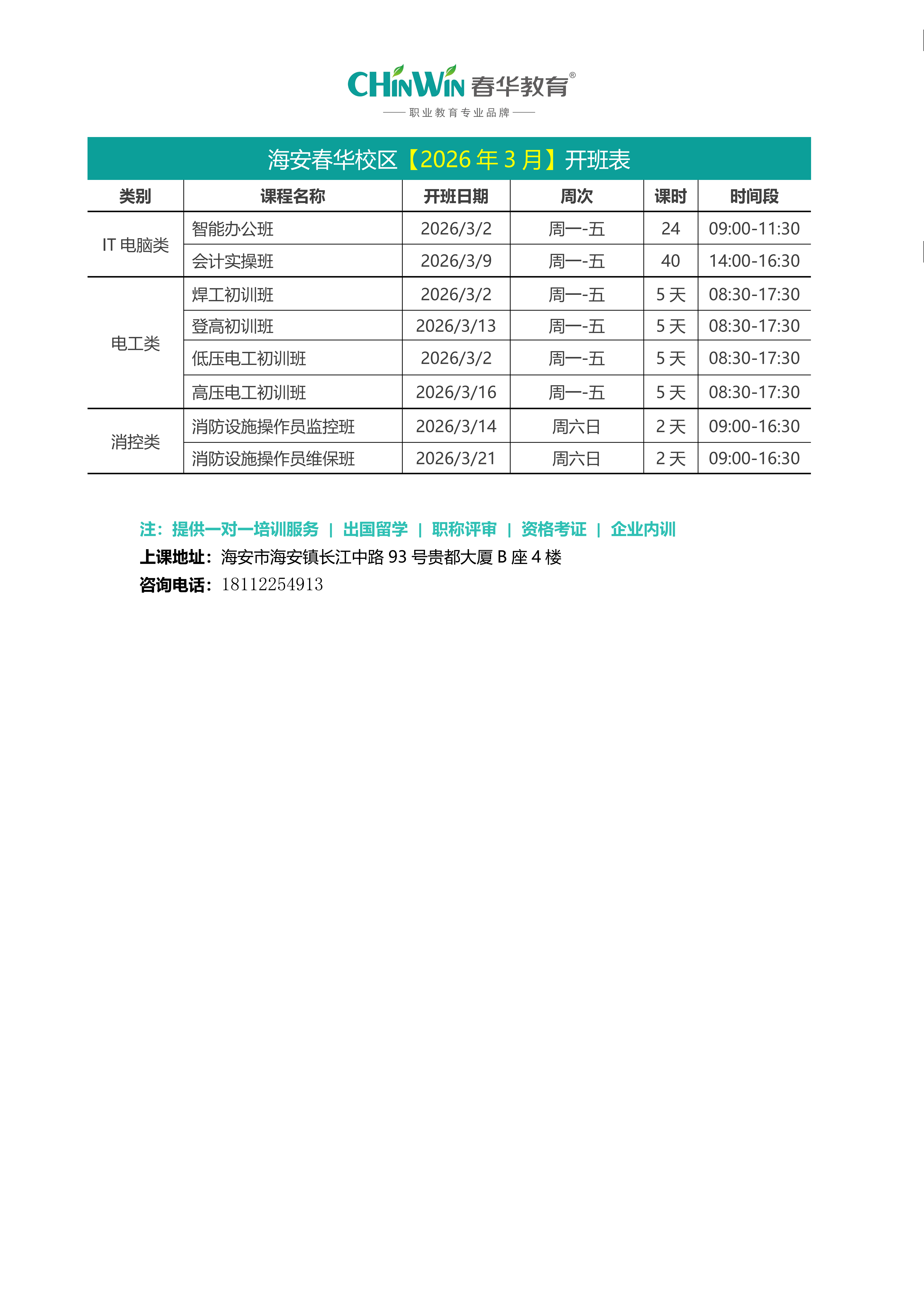 鄞州春华【3月】开班表