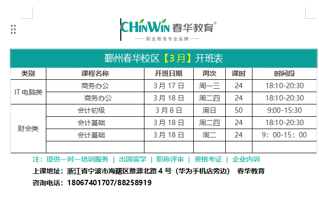 鄞州春华【3月】开班表