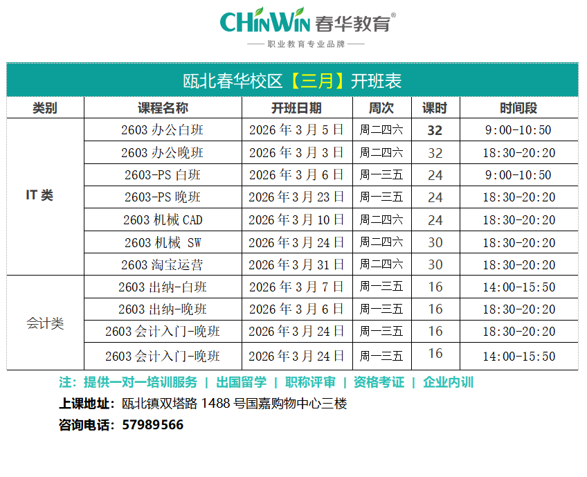 瓯海春华【3月】开班表