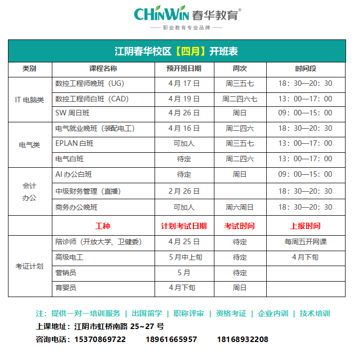江阴春华校区【四月】开班表