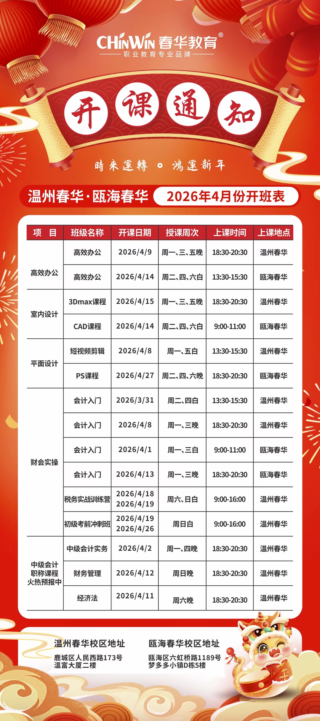 瓯海春华校区【四月】开班表