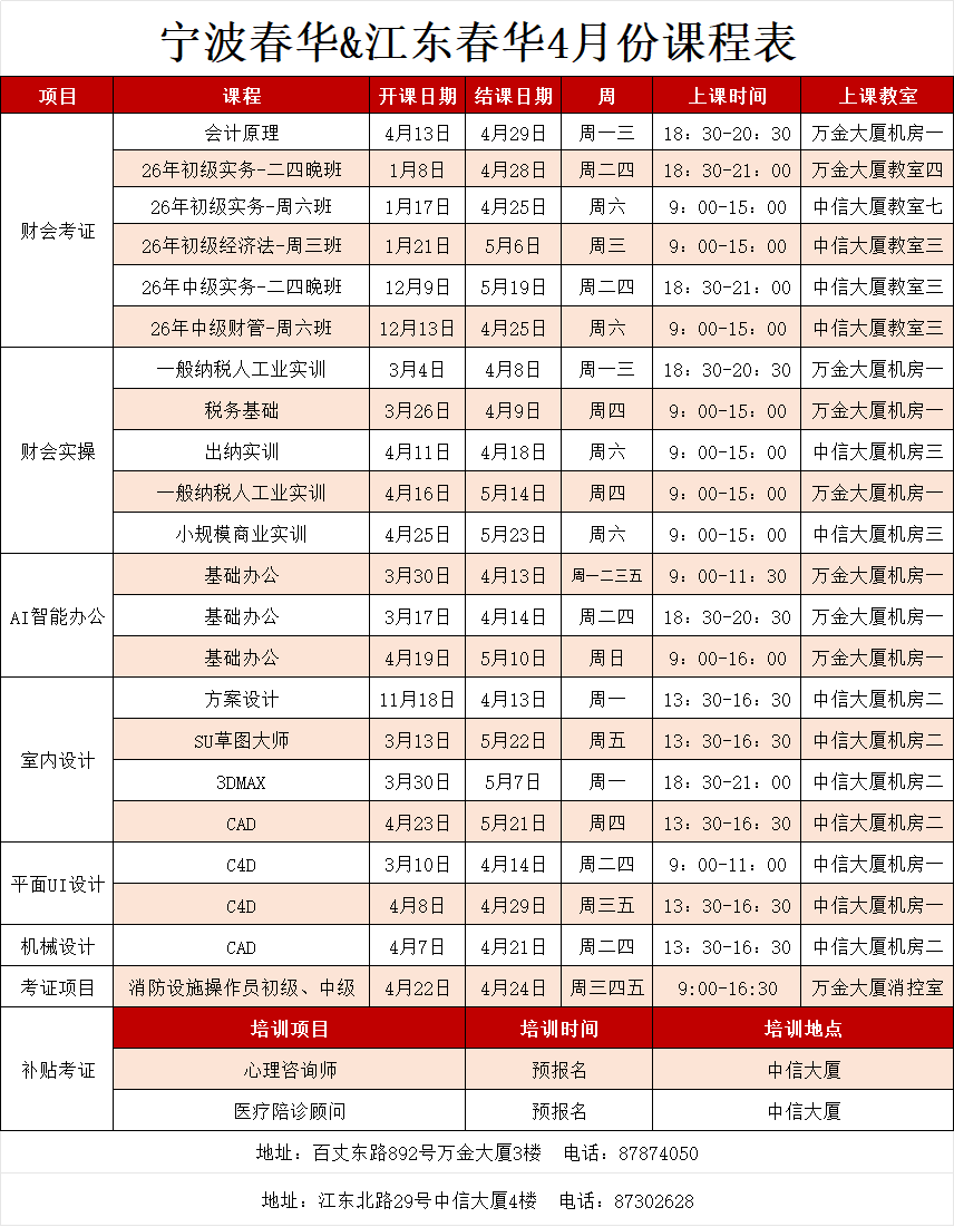宁波江东春华校区【四月】开班表