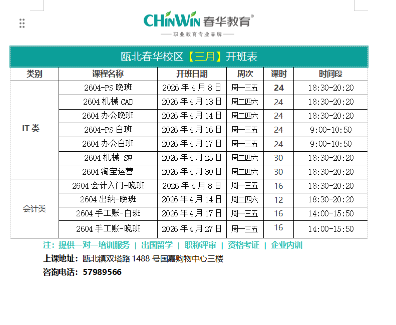 瓯北春华校区【四月】开班表