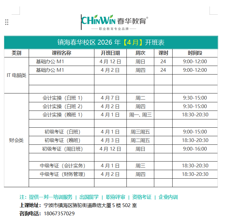 镇海春华校区【四月】开班表