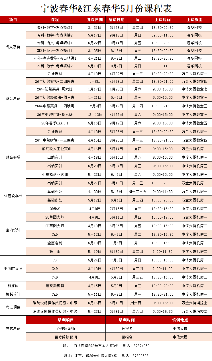 宁波&江东春华校区【五月】开班表
